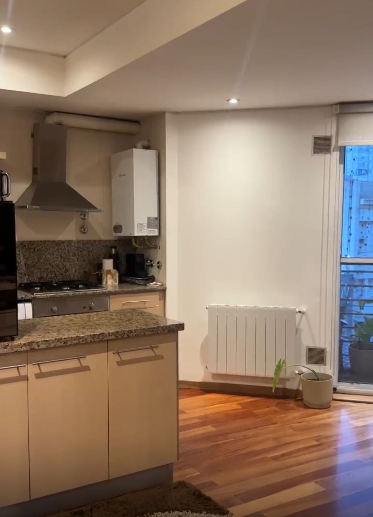 Living, comedor y cocina integrada.